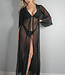 Bring irresistible allure to your lingerie collection with this sexy robe! Features a sheer long robe with sleeve lace, side slits, and front rhinestone button.