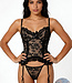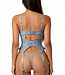 Structure meets seduction in this sheer lace bustier with satin bow accents, ruffled trim, adjustable straps, adjustable garter straps, and matching panty! (Comes with fishnet thigh highs)