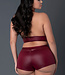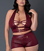Make a bold statement with this lingerie set! Crafted from sleek, stretch fabric with a faux leather lingerie look, this daring ensemble features a play top with striking cutouts, secured with straps and mini belt buckles for an edgy aesthetic. The halter-style neckline adds a touch of sophistication, while the hot shorts provide full coverage with a comfortable fit. A detachable buckled belt offers versatility, and nickel-plated studs, rings, and buckles complete the bold design. A must-have for any fetish-inspired collection. Queen.