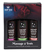 A gift set of three types of scented massage lotion that will keep both of you busy for months to come. Includes 2 fl. oz. bottles of Isle of You, Naked in the Woods, and Skinny Dip scents. Naked in the Woods has the scent of white tea and ginger. Isle of You has the scent of coconut water, citrus and vanilla. Skinny Dip has the scent of vanilla and cotton candy.