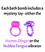 When the erotic scented bath bomb is disolved in the bath, it reveals a fun little toy vibe surprise. Inside is either a vibrating Humm Dinger or Nubbie Tongue Vibrator, perfect for after-bath fun. Great gift for the Bride to Be on her last night out.