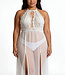 Slip into something effortlessly sultry with this sexy long gown! Features a sheer lace long gown with slits in bodice, halter neck, keyhole front with rhinestone hearts, soft cups, open back, and matching g-string panty! (Panty in picture is not g-string)