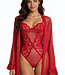 Dare to bare in this teddy? Features a sheer lace teddy with underwire cups, satin bow accent, adjustable straps, open front, and matching sheer arm length robe with slight ruffled trim. Read more..