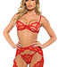 Stun in this gorgeous lingerie set! Features a Embroidered lace and stretch satin, Novelty scalloped elastic, Balconette cup with underwire, Peek-a-boo cup detail, Satin ribbon bow detail, Hook & eye closure. Embroidered lace and stretch satin, Novelty scalloped elastic, Satin ribbon bow detail, Open gusset, Hook closure. Mesh and stretch satin, Cotton gusset, Single string Thong Style Back.