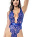A romantic teddy with an adjustable cross-tie back, featuring a plunge neckline, high-cut legs, and a hook-and-eye crotch closure.