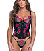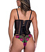 Accentuate your curves in this sexy black corset set featuring sheer mesh underwire cups with pink and green floral embroidery, adjustable spaghetti straps with gold hardware, a sheer bodice with built-in boning, allover floral embroidery, hook and eye fr Read more..