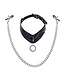 Elevate your scenes with the elegant dominance of the Velvet Noir Collar with Nipple Clamps. Crafted from smooth faux leather with a sleek marbled finish, this angled collar commands attention and control. Hematite-plated hardware, including a removable ring, offers both sophistication and functionality. A single metal chain connects to adjustable nipple clamps, adding a teasing element that can be removed for even more versatility. Use the collar with the clamps, swap in a leash, or wear it solo as a stylish day collar. Designed for both comfort and exploration, this piece invites you to play with power on your terms.