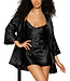 Look elegant while being comfortable in this sexy robe! Features a charmeuse short length kimono robe with attached belt and matching chemise with low back and adjustable criss-cross straps.