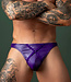 Turn heads with the Crossover Thong. This men’s purple thong is made of stretchy wet-look Cire fab..
